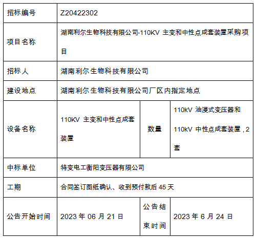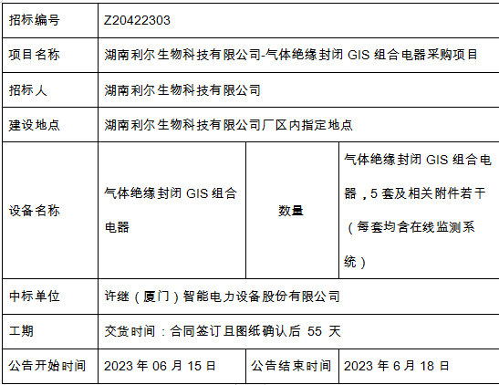 關(guān)于Z20422303-湖南利爾生物科技有限公司-氣體絕緣封閉GIS組合電器公開招標(biāo)采購結(jié)果公示:招標(biāo)編號Z2042...