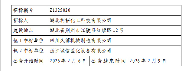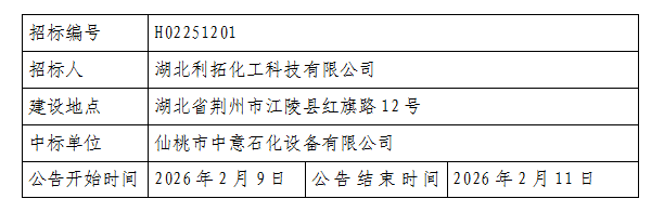 關于湖北利拓化工科技有限公司1批鋼制非標設備公開招標采購結果公示: 招標單位:利爾化學股份有限公司...